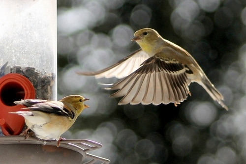 We have a flock taking turns (and fighting) at the feeder every day now. Looks like they’re getting a bit more yellow.