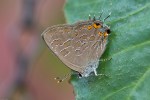 a tuberous begonia leaf. It is a Striped Hairstreak, a species I’ve not seen before. I had time to change lenses, line up,