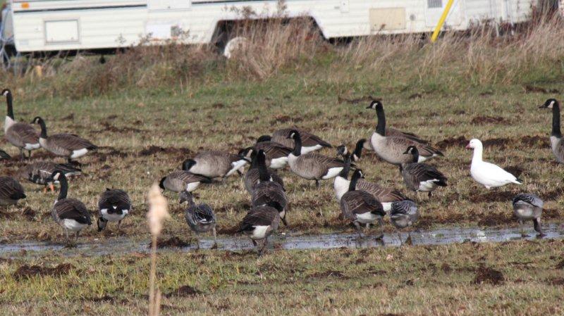 Geese 11, Ross’s Goose, Greater Whte-fronted Goose at Ste. Marie de Kent, photo by Jim Saunders, Nov 13, 2013