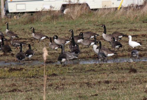 Geese 9, Ross’s Goose, Greater White-fronted Goose, at Ste. Marie de Kent, photo by Jim Saunders, Nov 13, 2013