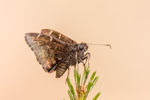 Small butterfly (a skipper). 30 mm in length. Displaying territorial behaviour by perching frequently on top of this small pine sapling. Photo taken in Miramichi on June 16, 2020.