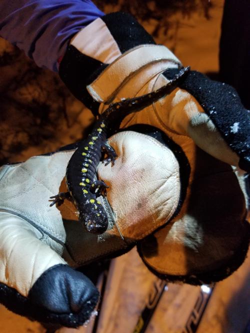 Chastity DeGroot found this Spotted Salamander on the MCCSC ski trails this evening.