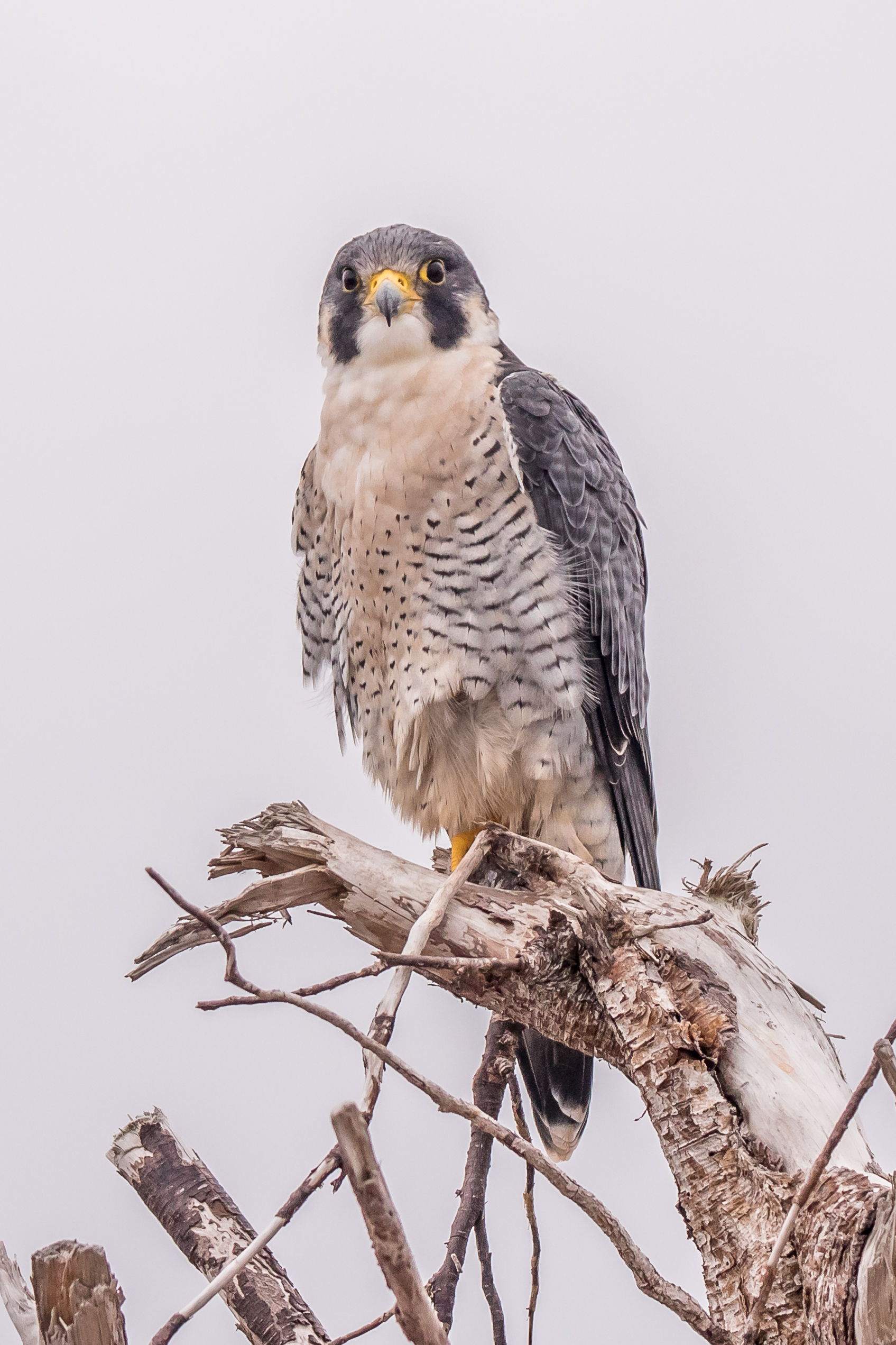 On the way we stopped at Saint Simeone de Bonaventure, perhaps one third of the way along the south coast. There is a spit of land that curls back into the coast. A great spot usually for shorebirds. In the past among others, we have been fortunate enough to spot a Hudsonian Godwit and on another occasion a few Golden Plovers. Well not on this visit. As we walked along a falcon flew over us and then back and landed on a large piece of driftwood tree trunk. Excitedly I started taking photos of its back, creeping up closer to get better shots of course … closer and closer and then right up to it and facing it, not ten feet away! It was a Peregrine and completely unconcerned about the two of us. Another Peregrine then landed nearby and seemed to be dining on some pray! It was the smaller of the two so presumably male and our chummy bird would have been a female. When the male eventually left our “buddy” followed. No shorebirds in the immediate area!!!