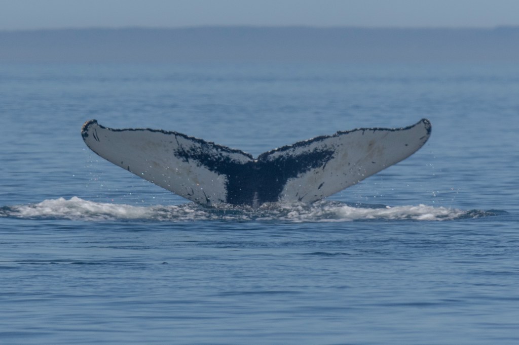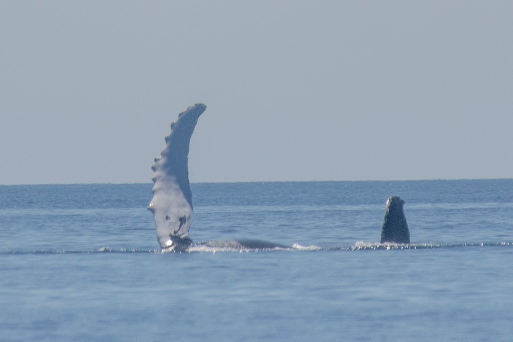 Although this was a birding tour a close encounter with a humpback whale added to the excitement. The sea was extremely calm and weather perfect, visibility was good. After seemingly waving to us with its fin (rolling on its back to do so), a humpback whale came quite close and “fluked” enabling a clear view of the underside of its tail. This will enable it to be identified by name as the pattern of a dark area on the underside is unique to the individual. Results of an enquiry awaits.