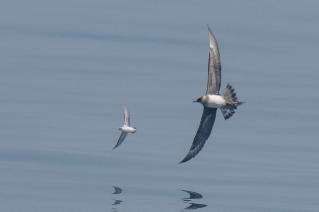 There were many Wilson’s storm-petrels as well as great shearwaters and Atlantic puffins. Apart from the jaeger, other more rare birds included sooty shearwaters and a first winter laughing gull. The red-necked phalaropes were present in the thousands, at one point concentrated in a relatively small area due likely to an up-welling current bringing “nutrition” from the deep.