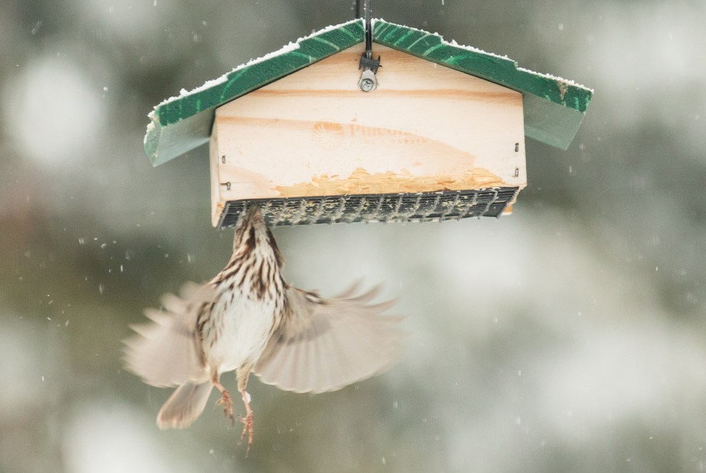 April 3rd, 2026 – Another snowy day in Miramichi made it once again a difficult time for birds that have returned early from the south. It was a very busy day at the bird feeders of Deana and Peter Gadd. A considerable number of red-winged blackbirds and common grackles tried to dominate both suspended bird feeders and seed scattered on the ground. One timid song sparrow eventually developed a few strategies to get its share, most interestingly, flying up to an upside down cage and taking some stabs at the suet held there.