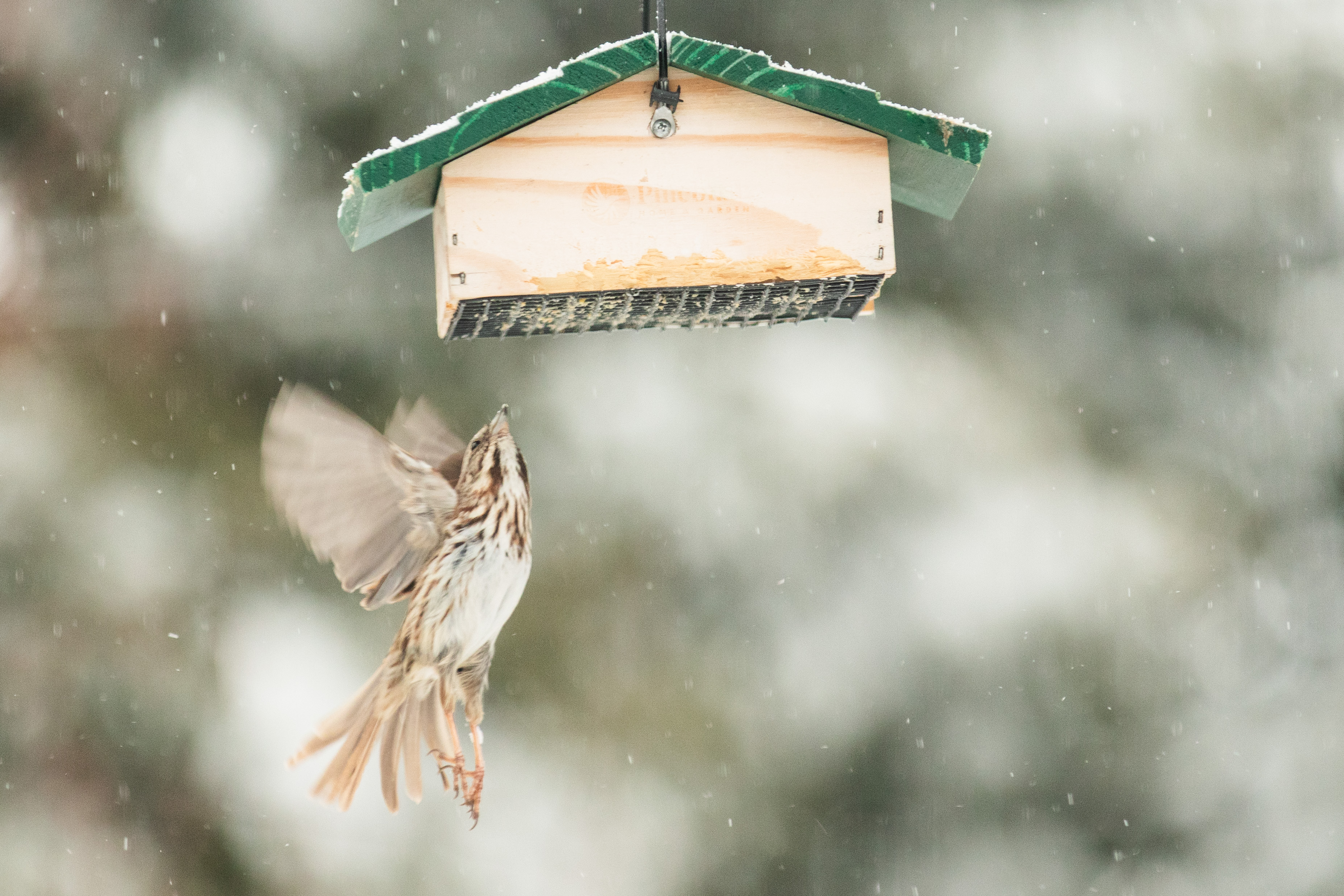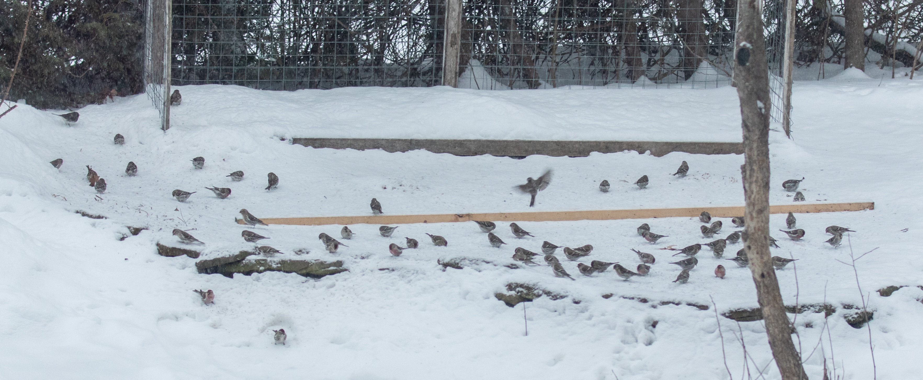 Song Sparrow stabbing at a suet cake. Redpolls feeding.