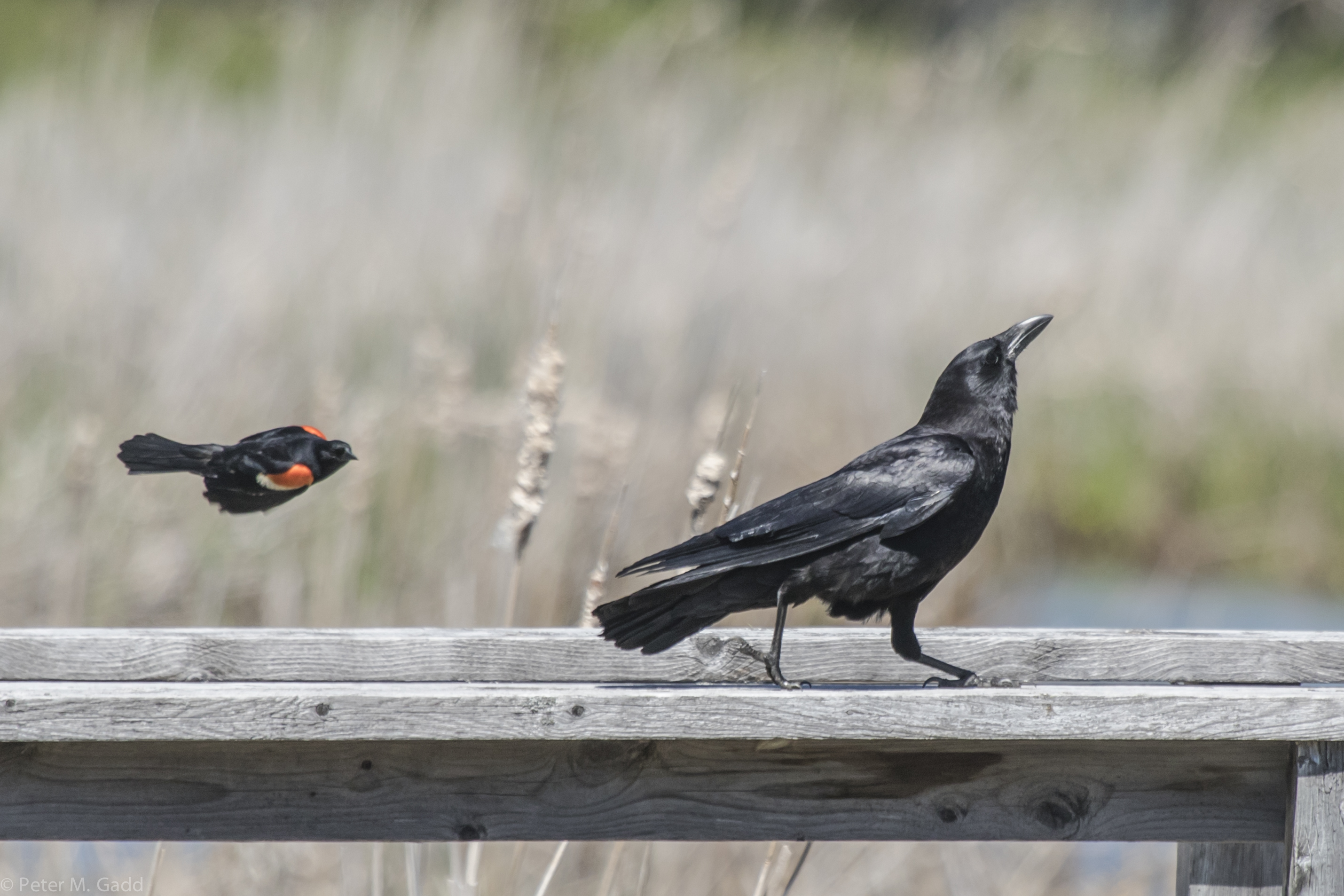 Red-winged Blackbird and Crow Scuffle