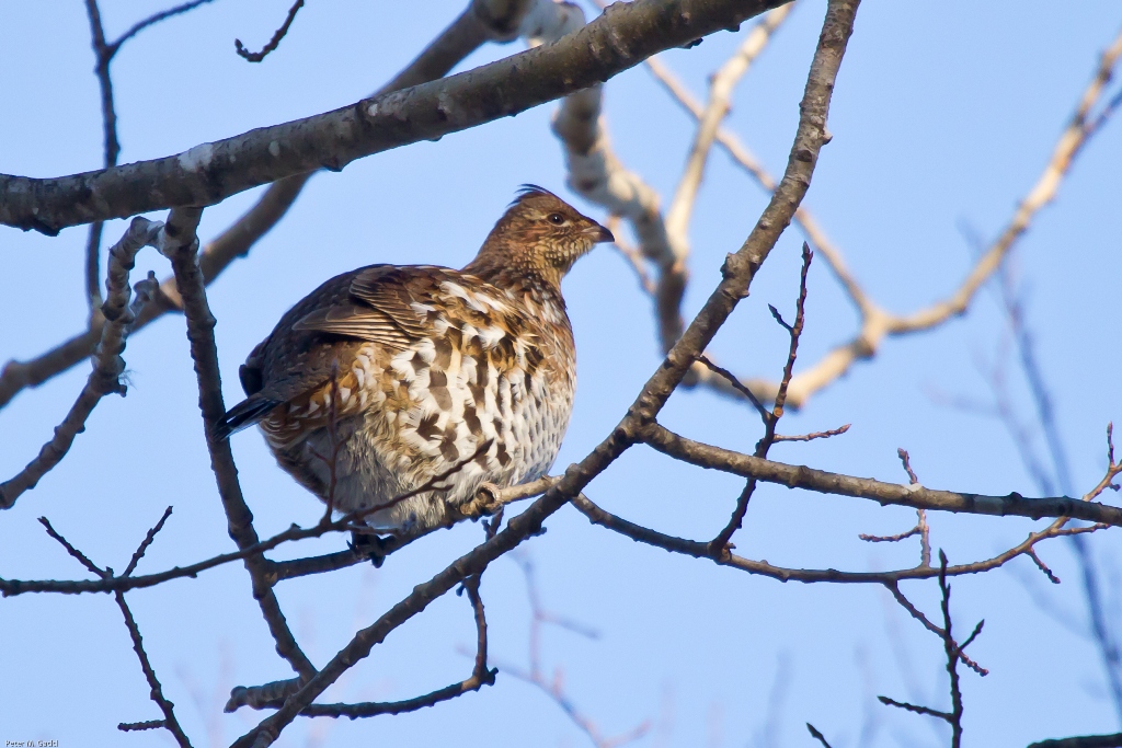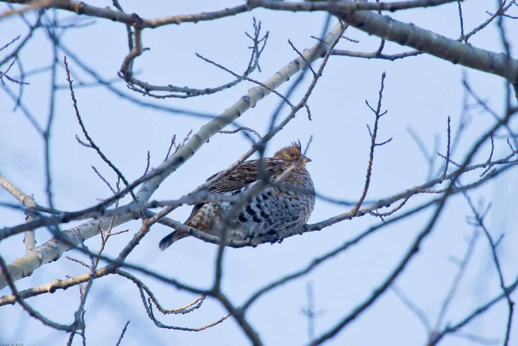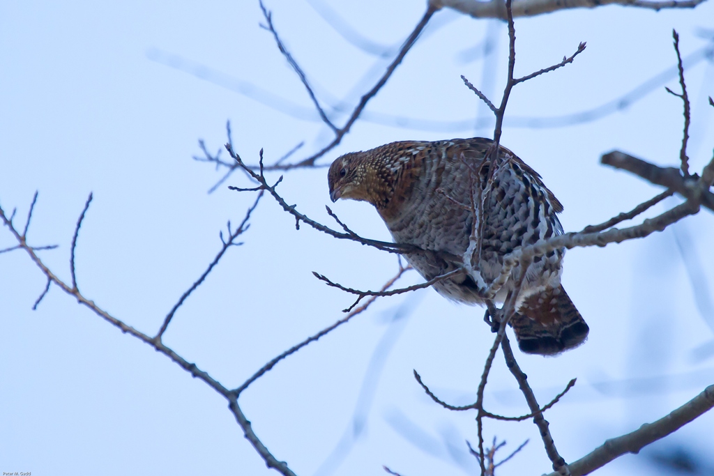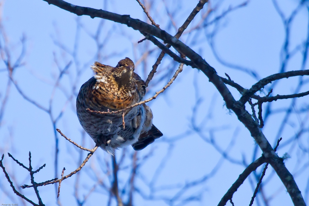 This Ruffed Grouse (below) was feeding on Poplar buds, walking uncertainly out on thinner and thinner branches. Millbank Nature Trail – February 12, 2012.